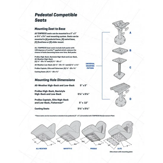 Tempress s’est associé à des chirurgiens de la colonne vertébrale et à des experts en ergonomie américains de premier plan pour créer le siège breveté révolutionnaire ProBax Captain avec accoudoirs. ProBax est la seule chaise de poisson cliniquement prouvée pour fournir un soutien optimal du dos et du haut du corps à long terme. Ce siège de bateau est équipé d’une base en mousse double cœur brevetée et d’un système de support dorsal, disponible uniquement via Tempress. Ce système est également résistant à l’eau et durable pour une utilisation à long terme. ProBax est cousu avec du fil de polyester résistant aux UV et à l’abrasion et recouvert de 30 oz. vinyle de qualité marine pour résister à tous les éléments. Huit inserts de montage intégrés s’adaptent à la plupart des systèmes coulissants avec un système de montage de 5 pouces en conjonction avec la plaque de montage Elite. Prenez le contrôle de votre expérience de navigation et de pêche, prenez le contrôle de votre corps et passez au ProBax de Tempress. Fabriqué aux Etats-Unis.